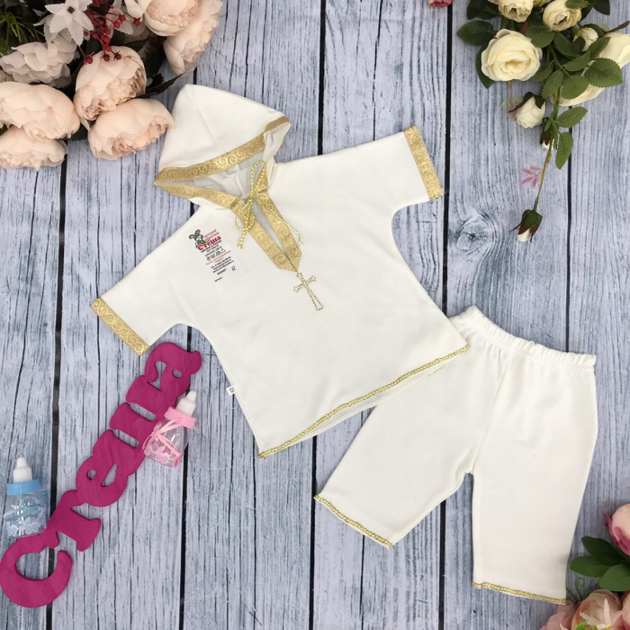 Теги: Купить оптом крестильную рубашку. 215-З. Крестильная рубашка со штанами (золото), интерлок 62,68,74,80 цена,отзывы официальный сайт "Стеша Камышин"